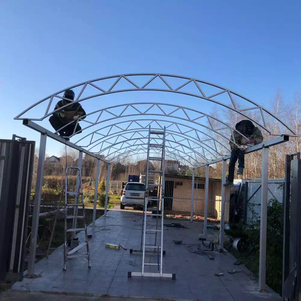 За день на даче изготовили арочный навес 5 на 7 с покрытием поликарбоната. Привезли уже готовые крашенные фермы и весь остальной материал. Все за собой убрали и увезли мусор. Молодцы!
